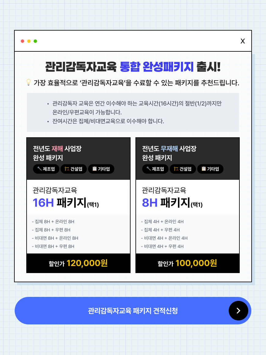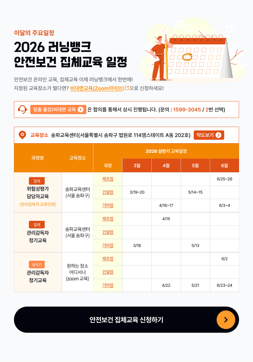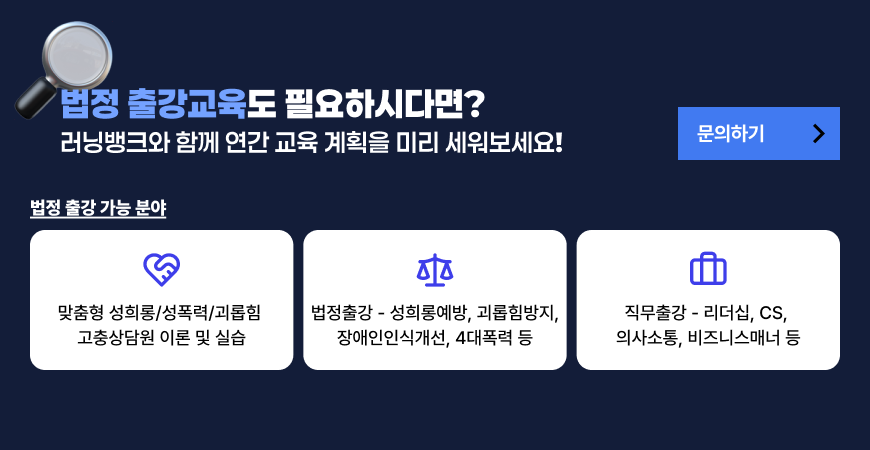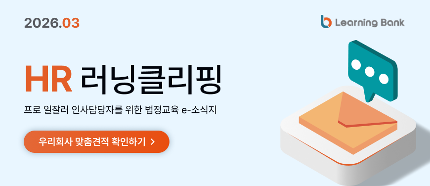 5대 법정의무교육 할인패키지 바로가기 직장 내 성희롱예방교육 바로가기 직장 내 장애인 인식개선교육 직장 내 괴롭힘예방교육 개인정보보호교육 퇴직연금제도 교육 안전보건교육 영문 근로자 정기교육 바로가기 안전보건교육 근로자 정기교육 바로가기 안전보건교육 관리감독자 정기교육 바로가기 안전보건교육 근로자 신규채용자교육 바로가기 안전보건교육 관리감독자 신규채용자교육 바로가기 안전보건교육 근로자 작업내용변경자교육 바로가기 안전보건교육 관리감독자 작업내용변경자교육 바로가기 안전보건교육 특수형태근로종사자교육 바로가기 안전보건교육 틀변안전보건교육 바로가기 4대 폭력예방교육 할인패키지 바로가기 4대 폭력예방교육 성희롱예방교육 4대 폭력예방교육 성폭력예방교육 4대 폭력예방교육 성매매예방교육 4대 폭력예방교육 가정폭력예방교육 금융법정교육 자금세탁방지교육 바로가기 금융법정교육 금융소비자보호교육 바로가기 2026 러닝뱅크 온라인 교육과정 전체 리스트 다운로드 러닝뱅크 안전보건교육 집체/비대면교육 일정 바로가기